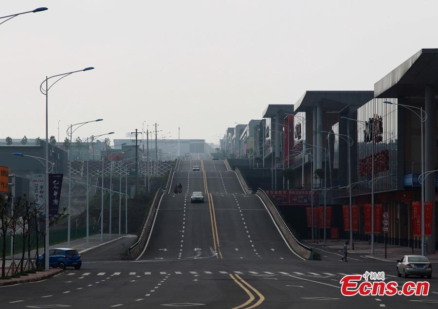 A road travels up and down in Jieshi Town, Banan District, Southwest China’s Chongqing Municipality, Sept. 7, 2017. Real estate developers built the 300-meter-long rolling road to enable adjacent stores to directly link to the road. Seen from a distance, the road looks like waves. Some drivers say it’s thrilling to drive on. (Photo: China News Service/Zhou Yi) |