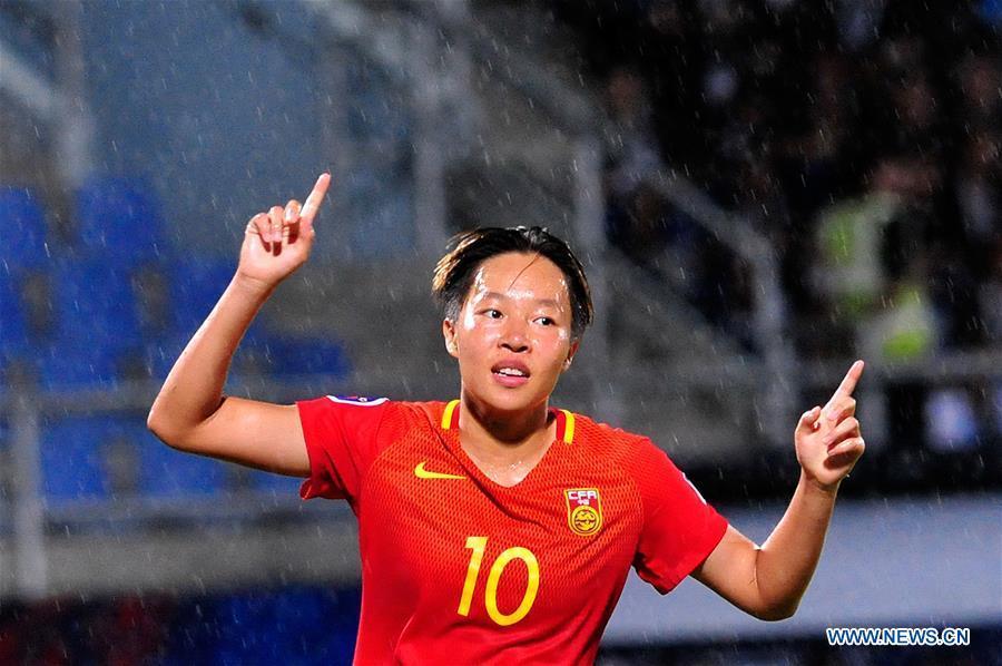Tang Han of China celebrates scoring during the AFC U-16 Women's Championship 2017 Group A match against Thailand at Chonburi Stadium in Chonburi, Thainland, Sept. 16, 2017.China won 6-1. (Xinhua/Rachen Sageamsak)