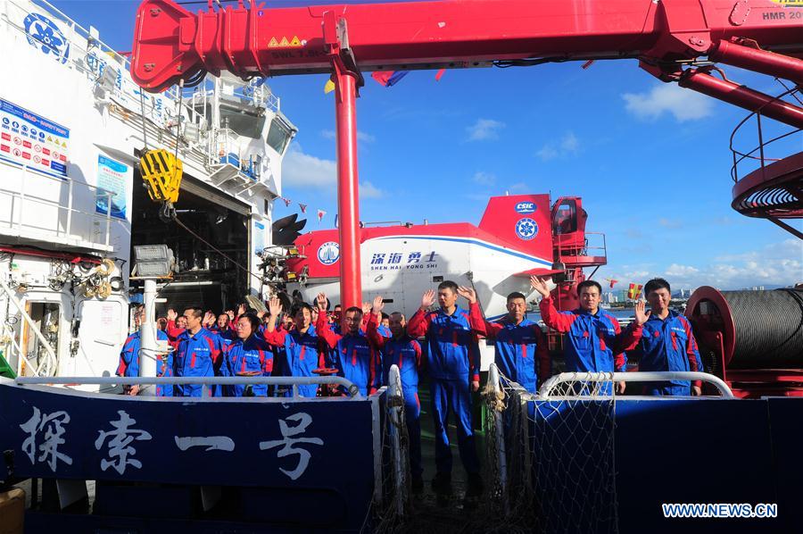 The manned submersible named Shenhai Yongshi, or deepsea warrior, on board the ship Tansuo-1 arrives at port in Sanya, south China's Hainan Province, Oct. 3, 2017. China's new manned submersible, on board the ship Tansuo-1, returned to port in Sanya on Tuesday, after completing deep sea testing in the South China Sea. The manned submersible named Shenhai Yongshi reached a depth of 4,500 meters to test its functions and performance during an over 50-day expedition. (Xinhua/Sha Xiaofeng)