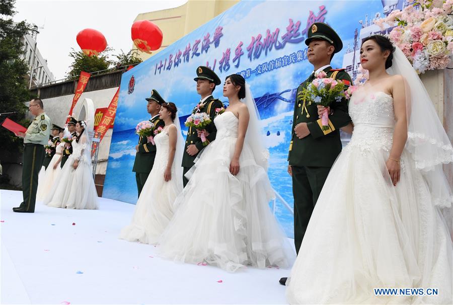 Coast guards and their spouses take part in a group wedding ceremony in southeast China's Fujian Province, Nov. 11, 2017. Six newly-married couples participated in the ceremony. (Xinhua/Zhang Guojun)