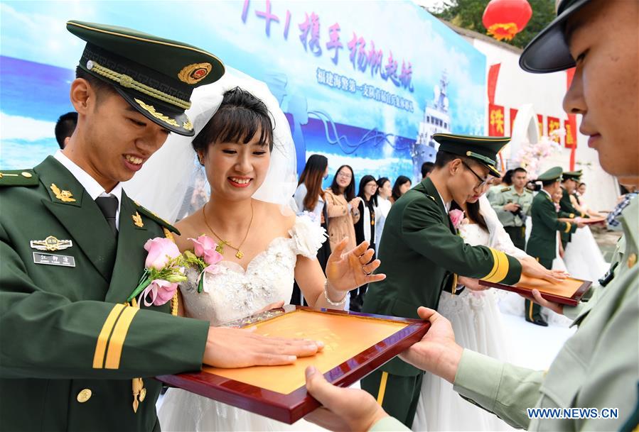 Coast guards and their spouses take part in a group wedding ceremony in southeast China's Fujian Province, Nov. 11, 2017. Six newly-married couples participated in the ceremony. (Xinhua/Zhang Guojun) |