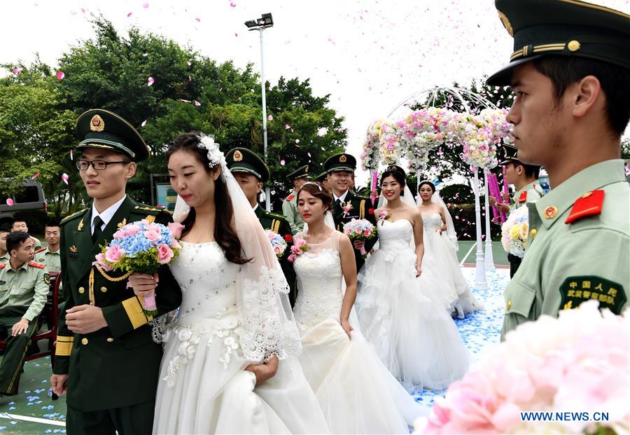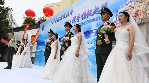 Coast guards and their spouses take part in a group wedding ceremony in southeast China's Fujian Province, Nov. 11, 2017. Six newly-married couples participated in the ceremony. (Xinhua/Zhang Guojun) |