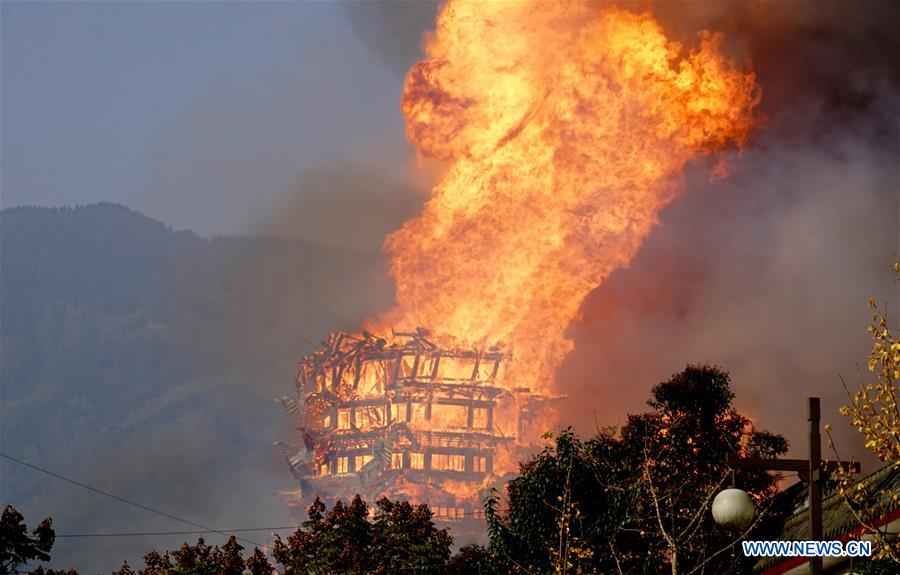 The flame engulfs a wood pagoda in a temple in Jiulong Township of Mianzhu City, southwest China's Sichuan Province, Dec. 10, 2017. (Xinhua)