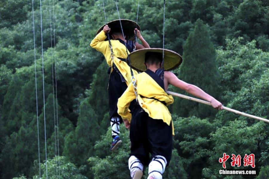 E-mail Ecns.cn, April 29, 2018Kung Fu masters practice martial arts and Shaolin Kung Fu 80 meters above Mount Song for the Shaolin Zen Music Ritual in Dengfeng, C China's Henan province, on April 28, 2018. The show premiered in 2007 and has been performed over 4,000 times. (Photo: China News Service/Wang Zhongju)