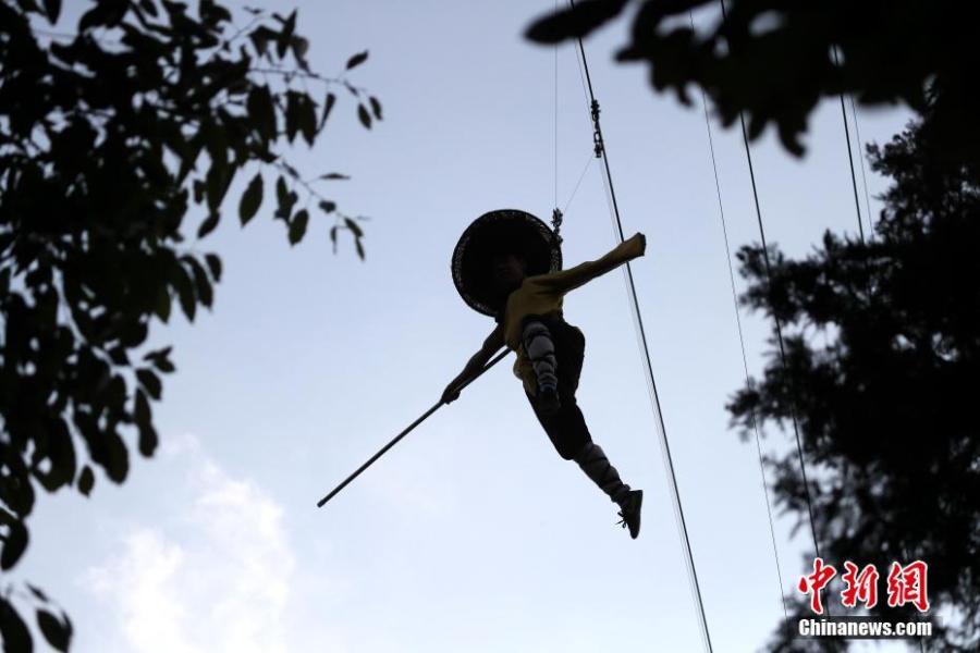 E-mail Ecns.cn, April 29, 2018A Kung Fu master practices martial arts and Shaolin Kung Fu 80 meters above Mount Song for the Shaolin Zen Music Ritual in Dengfeng, C China's Henan province, on April 28, 2018. The show premiered in 2007 and has been performed over 4,000 times. (Photo: China News Service/Wang Zhongju)
