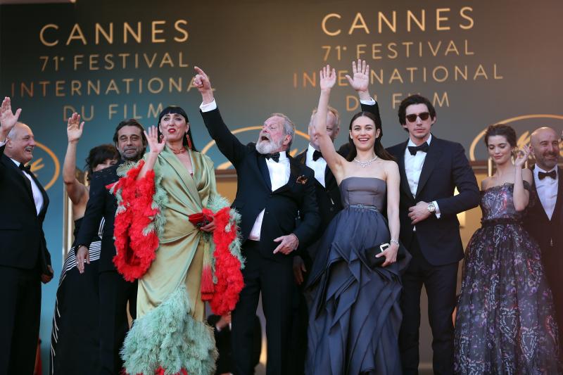 E-mail Xinhua, May 21, 2018Director Terry Gilliam (5th L) gestures with other cast memebers during the screening of "The Man Who Killed Don Quixote" and the Closing Ceremony during the 71st annual Cannes Film Festival at Palais des Festivals in Cannes, France, on May 19, 2018. (Xinhua/Luo Huanhuan)
