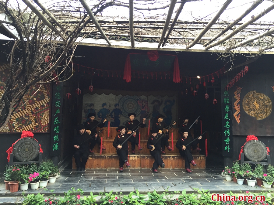Shi Wai Tao Yuan, also known as Shangri-La Park, is an AAAA-level rated scenic spot located in Yangshuo county, Guilin, Guangxi Zhuang autonomous region. It is famous for its beautiful karst scenery and the traditional customs of the Zhuang and other local ethnic minorities, which can make tourists feel far away from the turmoil of the world. The name, meaning “land of peach blossoms,” originated from the peaceful land described in an essay by Tao Yuanming, an idyllist of the Eastern Jin Dynasty (317-420). [Photo by Li Na / China.org.cn]