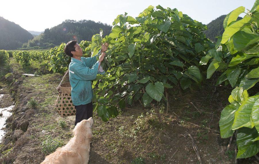 E-mail Xinhua, July 3, 2018Wang Tiangui collects mulberry leaves to feed silkworms at a silkworm breeding base of Cathaya Group in Wangcun Village of Chun'an County, east China's Zhejiang Province, May 9, 2018. Chun'an County cooperated with Cathaya Group in building silkworm breeding bases to produce high quality cocoon and silk products. To date, about 4,000 hectares mulberry bushes have been cultivated and some 300 tonnes raw silk are produced per year. (Xinhua/Weng Xinyang)