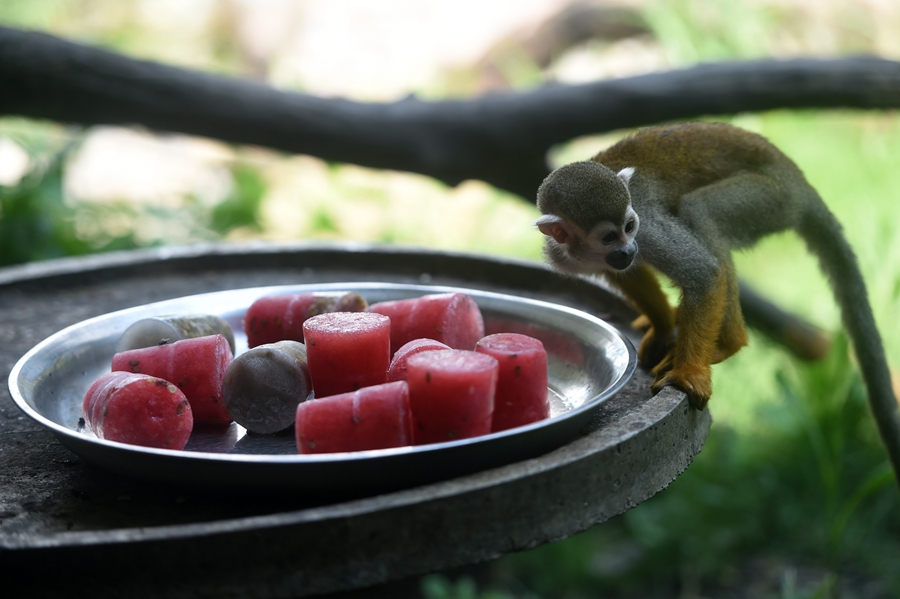 Frozen food is offered to a common squirrel monkey to help it cool off from summer heat waves at Chongqing Zoo in southwest China's Chongqing, July 13, 2018. (Xinhua/Tang Yi)