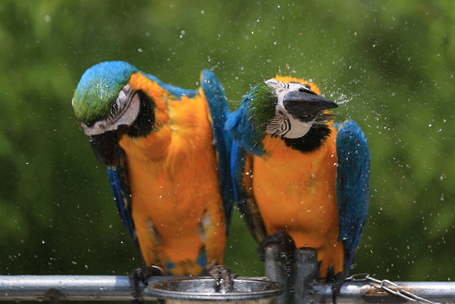 E-mail Xinhua, July 14, 2018Two parrots take a shower to cool off at a zoo in Zhuquan Village of Linyi City, east China's Shandong Province, July 13, 2018. Zoo authorities have taken measures to keep the animals cool in the summer around China. (Xinhua/Wang Yanbing)