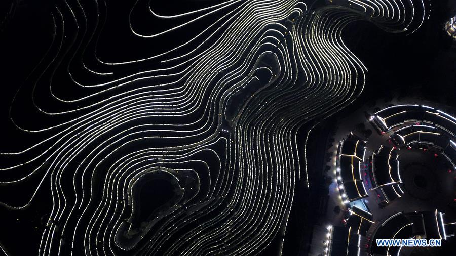 E-mail Xinhua, December 18, 2019Aerial photo taken on Dec. 16, 2019 shows a night view of terraced fields in Shexiang ancient town in Dafang County of Bijie, southwest China's Guizhou Province. Shexiang ancient town is a relocation area for residents living in impoverished regions with no sustainable conditions. Local government preserves the natural elements during planning and construction. In the center of the town, a total of 12 hectares of terraced fields, covered with ornamental plants, are built up to create a good environment for the people. (Xinhua/Yang Wenbin)