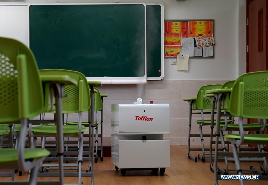 E-mail Xinhua, April 22, 2020A disinfection robot works at a classroom in a middle school in east China's Shanghai, April 21, 2020. In Shanghai, classes for senior students in middle and high schools will resume on April 27. Those schools have been actively making full preparations for the reopening to ensure the safety of the students and teachers. (Xinhua/Liu Ying)