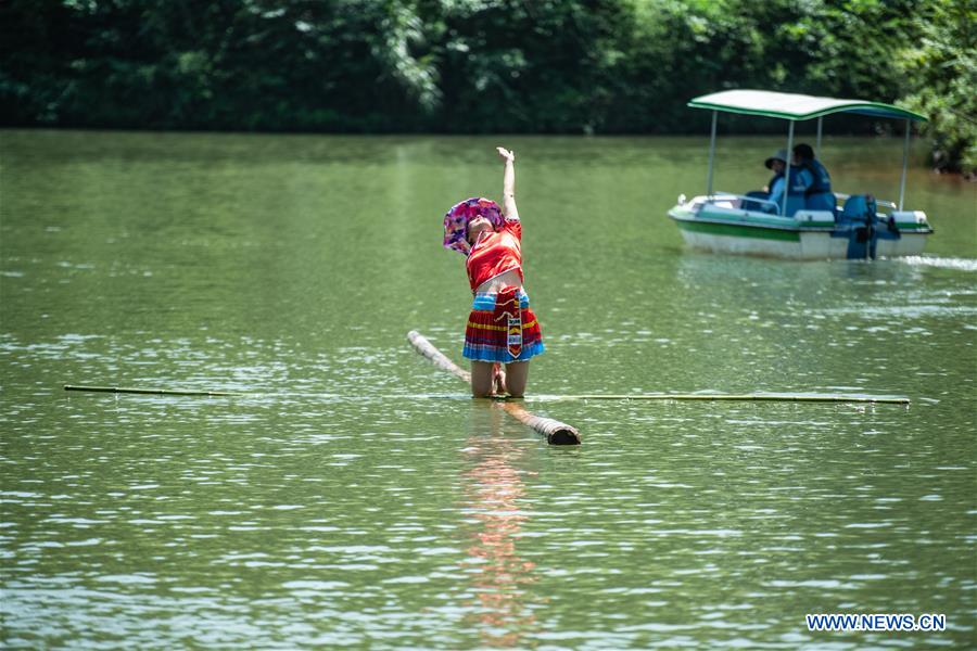 E-mail Xinhua, June 26, 2020A woman performs single bamboo drifting on water in Chishui, southwest China's Guizhou Province, June 25, 2020. Single bamboo drifting originated in China's Guizhou and requires a person to stand or sit on a single piece of bamboo while performing balancing movements. (Xinhua/Tao Liang)