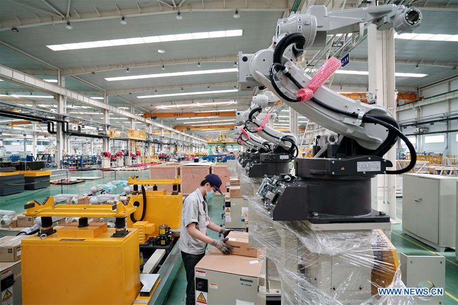 A worker checks a product at a workshop in the Tangshan Hi-tech Industrial Development Zone in Tangshan, north China's Hebei Province, July 17, 2020. Tangshan Hi-tech Industrial Development Zone has formed a robotics industry with 62 robots and related enterprises. (Xinhua/Mu Yu)