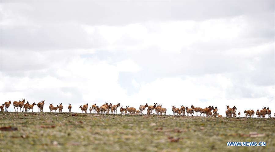 Photo taken on July 17, 2020 shows Tibetan antelopes grazing near Rongmar Township of Nyima County at the Qiangtang National Nature Reserve in southwest China's Tibet Autonomous Region. The population of wild animals in the state-level nature reserve has increased in recent years thanks to effective protection efforts. The Tibetan antelope population in the nature reserve has exceeded 150,000, of which nearly 60,000 are now seen near Rongmar Township located in the heart of the nature reserve. (Xinhua/Chogo)