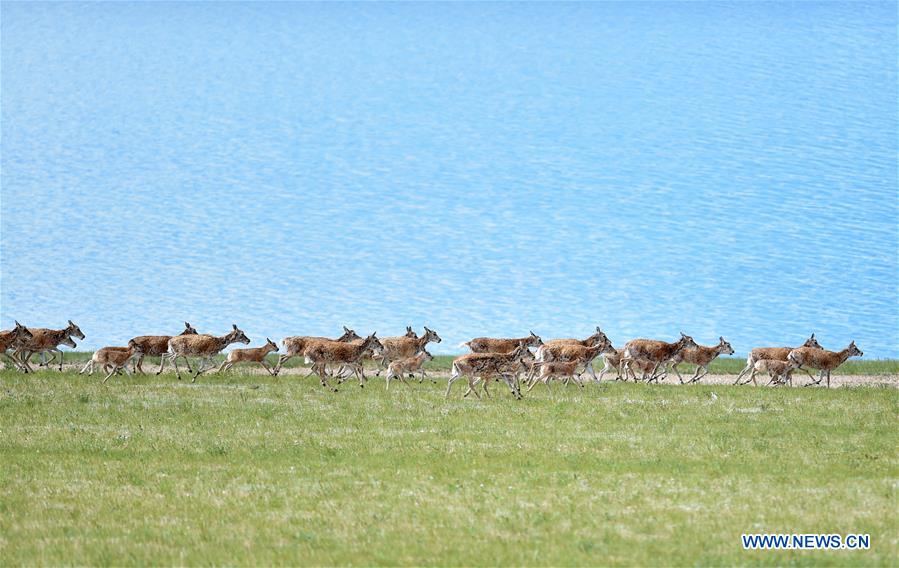 E-mail Xinhua, July 22, 2020Photo taken on July 19, 2020 shows Tibetan antelopes near Co Ngoin Lake in southwest China's Tibet Autonomous Region. The population of wild animals in the state-level nature reserve has increased in recent years thanks to effective protection efforts. The Tibetan antelope population in the nature reserve has exceeded 150,000, of which nearly 60,000 are now seen near Rongmar Township located in the heart of the nature reserve. (Xinhua/Chogo)