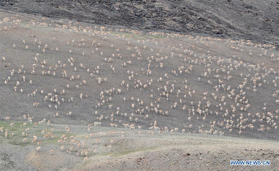 E-mail Xinhua, July 22, 2020Photo taken on July 17, 2020 shows Tibetan antelopes grazing near Rongmar Township of Nyima County at the Qiangtang National Nature Reserve in southwest China's Tibet Autonomous Region. The population of wild animals in the state-level nature reserve has increased in recent years thanks to effective protection efforts. The Tibetan antelope population in the nature reserve has exceeded 150,000, of which nearly 60,000 are now seen near Rongmar Township located in the heart of the nature reserve. (Xinhua/Chogo)