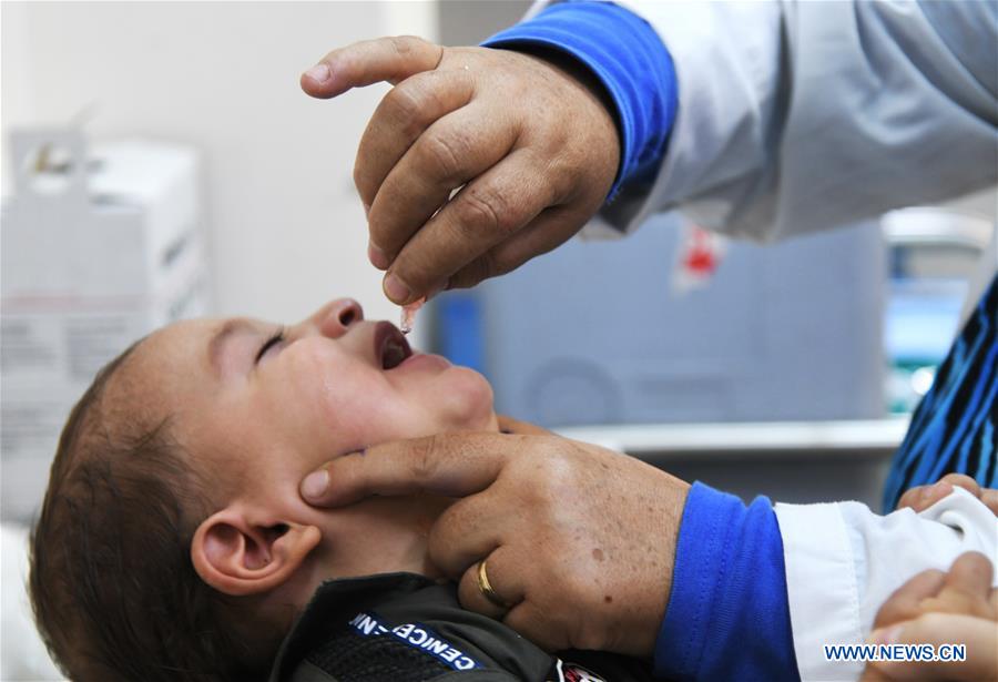 A health worker gives a polio vaccine to a child during an anti-polio vaccination campaign in Damascus, capital of Syria, on Oct. 11, 2020. (Photo by Ammar Safarjalani/Xinhua)