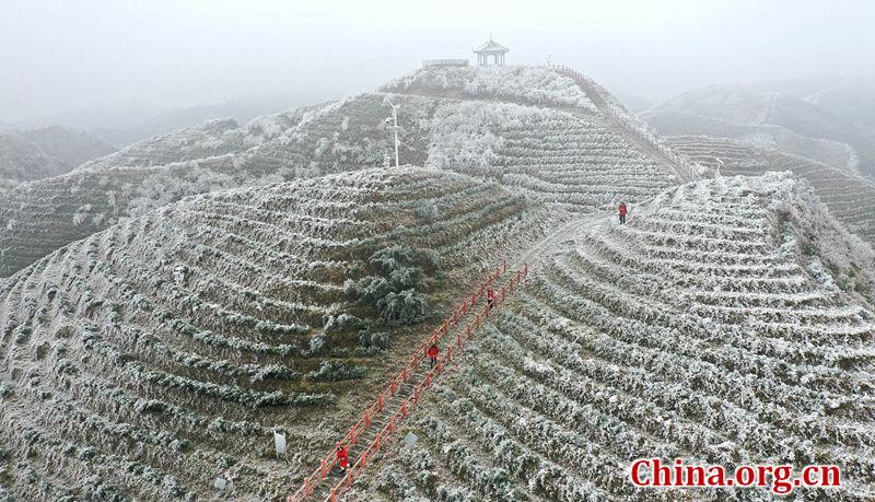 E-mail China.org.cn, December 17, 2020Aerial photo taken on Dec. 16, 2020 shows the organic tea garden at an elevation of 1,100 meters covered by ice and snow due to continual low temperature in Dudong town, Liuzhou city, in south China's Guangxi Zhuang Autonomous Region. The astounding scenery has attracted many visitors. [Photo/VCG]