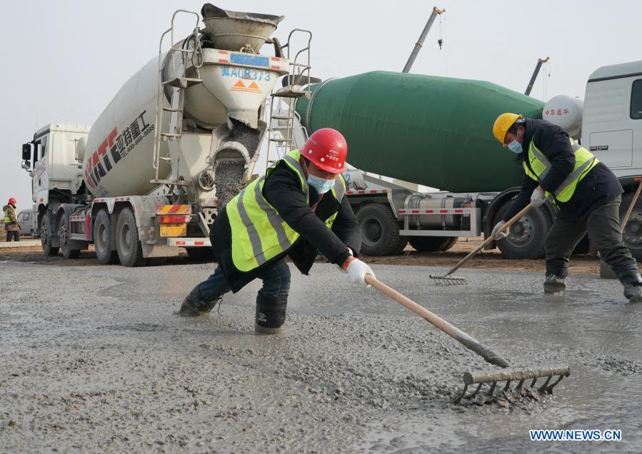 E-mail Xinhua, January 15, 2021Workers harden the road surface on the construction site of a centralized medical observation center in Shijiazhuang, capital of north China's Hebei Province, Jan. 14, 2021. Construction workers on Wednesday started building a centralized medical observation center in Shijiazhuang, capital of north China's Hebei Province, where clustered COVID-19 cases occurred. The isolation center will likely cover 33 hectares of area near a village in Zhengding County, Shijiazhuang. Three integrated housing producers in Tangshan City, Hebei, have been entrusted to produce 3,000 makeshift wards for the center. Each ward has a space of 18 square meters. (Xinhua/Yang Shiyao)