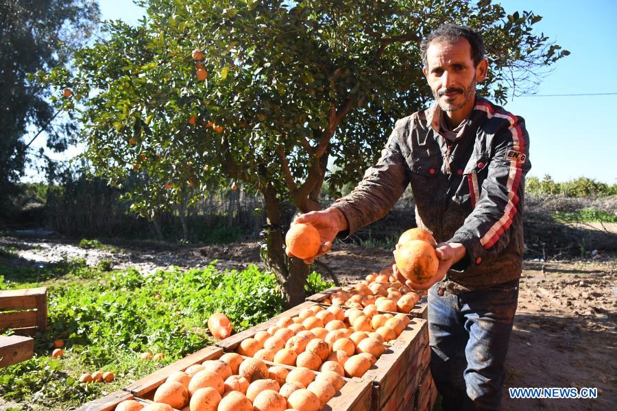 A worker presents oranges at a farm in Meknes, Morocco, Jan. 14, 2021. (Photo by Chadi/Xinhua)