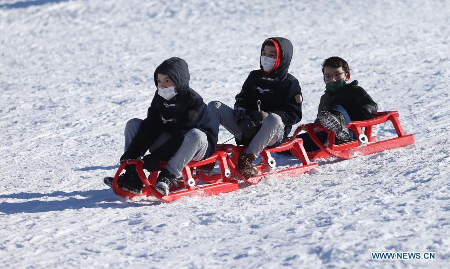People enjoy snow at a ski resort in Ankara, Turkey, Jan. 22. 2021. [Photo/Xinhua]