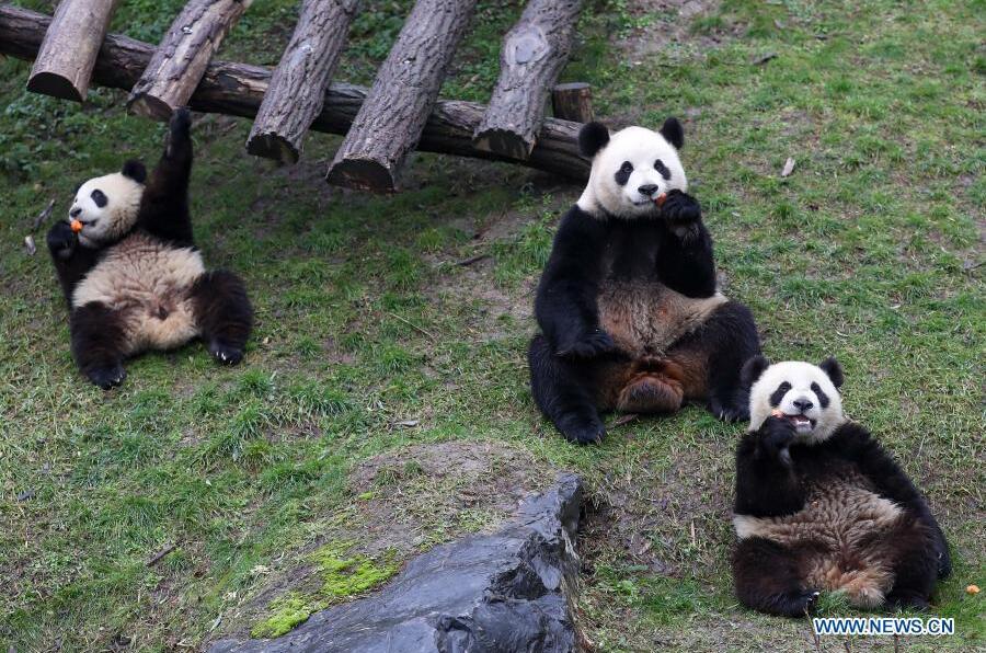 E-mail Xinhua, February 1, 2021Giant panda Hao Hao and her twin cubs Bao Di and Bao Mei enjoy eating at the Pairi Daiza zoo in Brugelette, Belgium, Jan. 27, 2021. Pairi Daiza zoo hosts five giant pandas currently, including father Xing Hui, mother Hao Hao, and three children Tian Bao, Bao Di and Bao Mei. Bao Di and Bao Mei are twins born in August 2019 after the birth of Tian Bao in June 2016. [Photo/Xinhua]