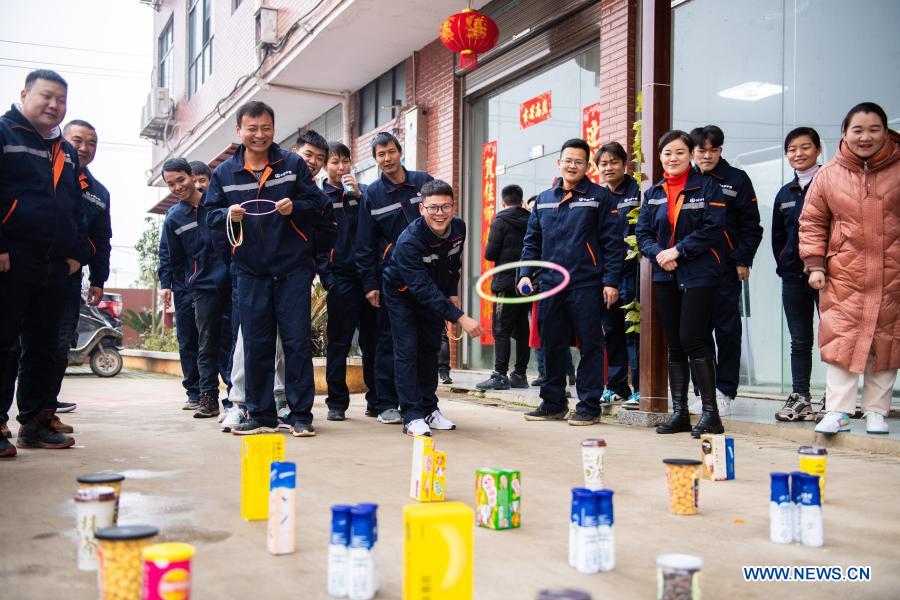 Staff members of Shanghai Civil Engineering Co., Ltd. of CREC (China Railway Engineering Group Ltd.) participate in a game in celebration of the upcoming Spring Festival in central China's Hunan Province, Feb. 11, 2021. This year's Spring Festival falls on Friday. (Xinhua/Chen Sihan)