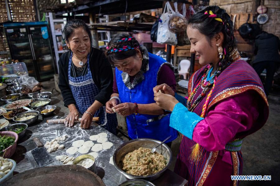 Tashi Yudron makes dumplings with her mother and mother-in-law in Medog, southwest China's Tibet Autonomous Region, Feb. 11, 2021. [Photo/Xinhua]