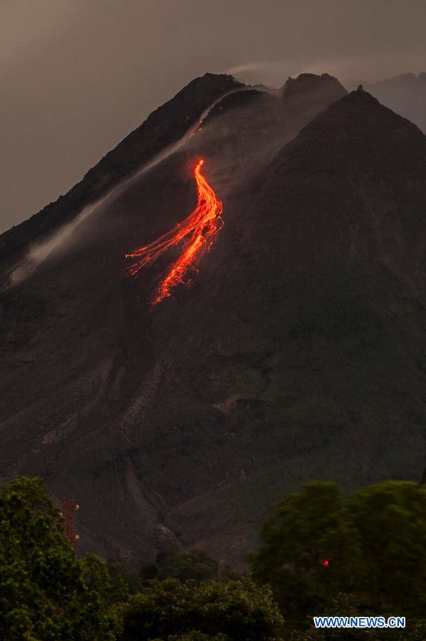 Photo taken on March 1, 2021 shows volcanic materials spewing from Mount Merapi, viewed from Kaliurang, Yogyakarta, Indonesia. [Photo/Xinhua]