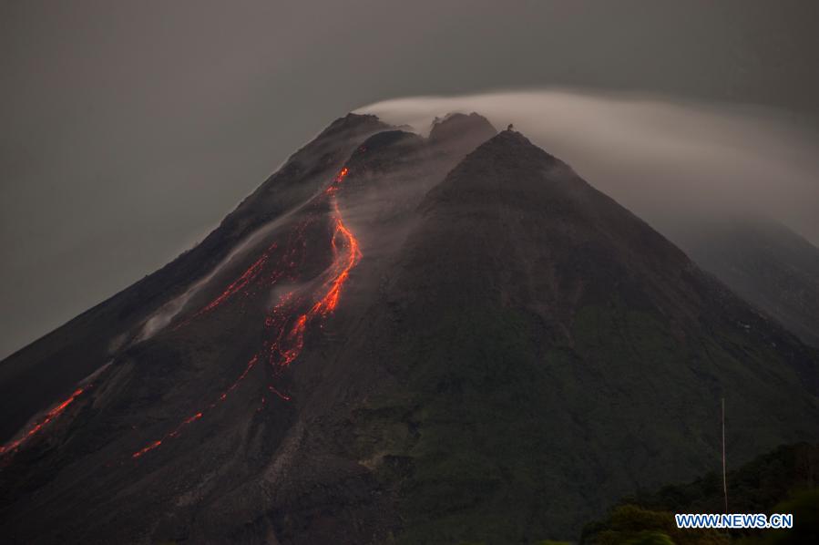 Photo taken on March 1, 2021 shows volcanic materials spewing from Mount Merapi, viewed from Kaliurang, Yogyakarta, Indonesia. [Photo/Xinhua]