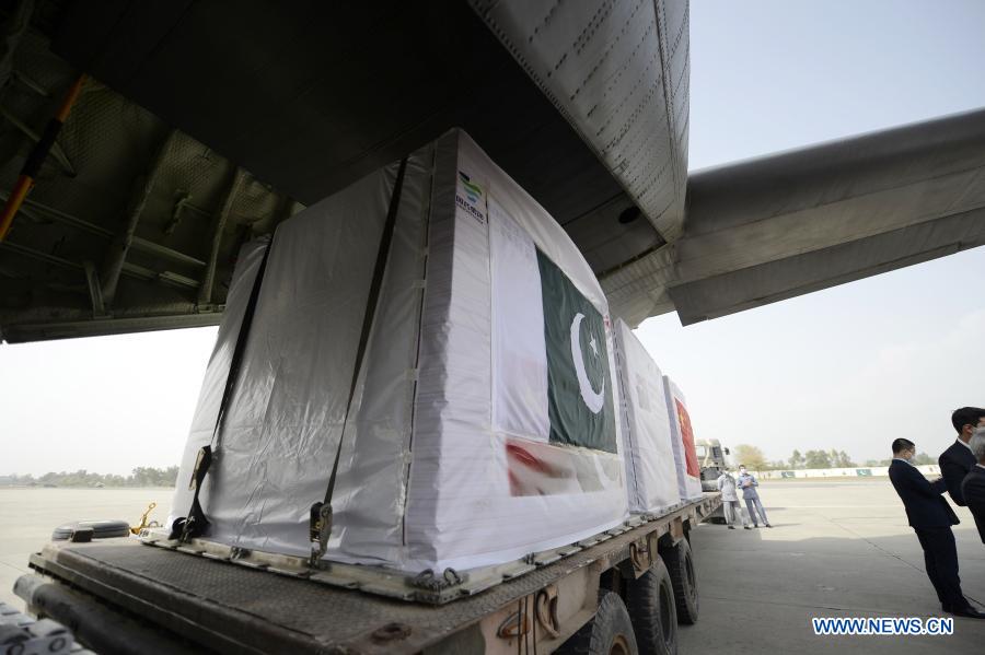 A handover ceremony is held for the second batch of COVID-19 vaccines donated by the Chinese government at Noor Khan Air Base near Islamabad, capital of Pakistan, March 17, 2021. [Photo/Xinhua]