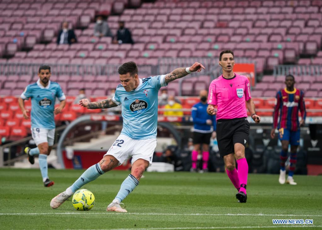 Celta's Santi Mina (L, front) scores a goal during a Spanish league football match between FC Barcelona and Celta Vigo in Barcelona, Spain, on May 16, 2021. (Photo by Joan Gosa/Xinhua)