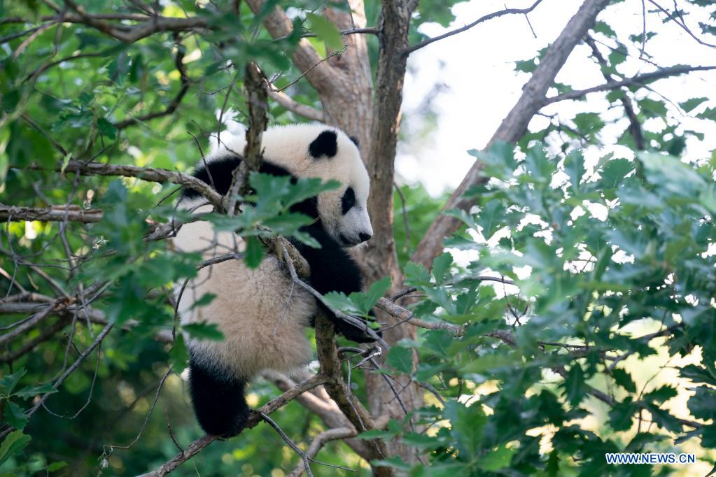 Photo taken on May 20, 2021 shows the giant panda cub "Xiao Qi Ji" (little miracle) during a media preview at Smithsonian's National Zoo in Washington, D.C., the United States. (Xinhua/Liu Jie)
