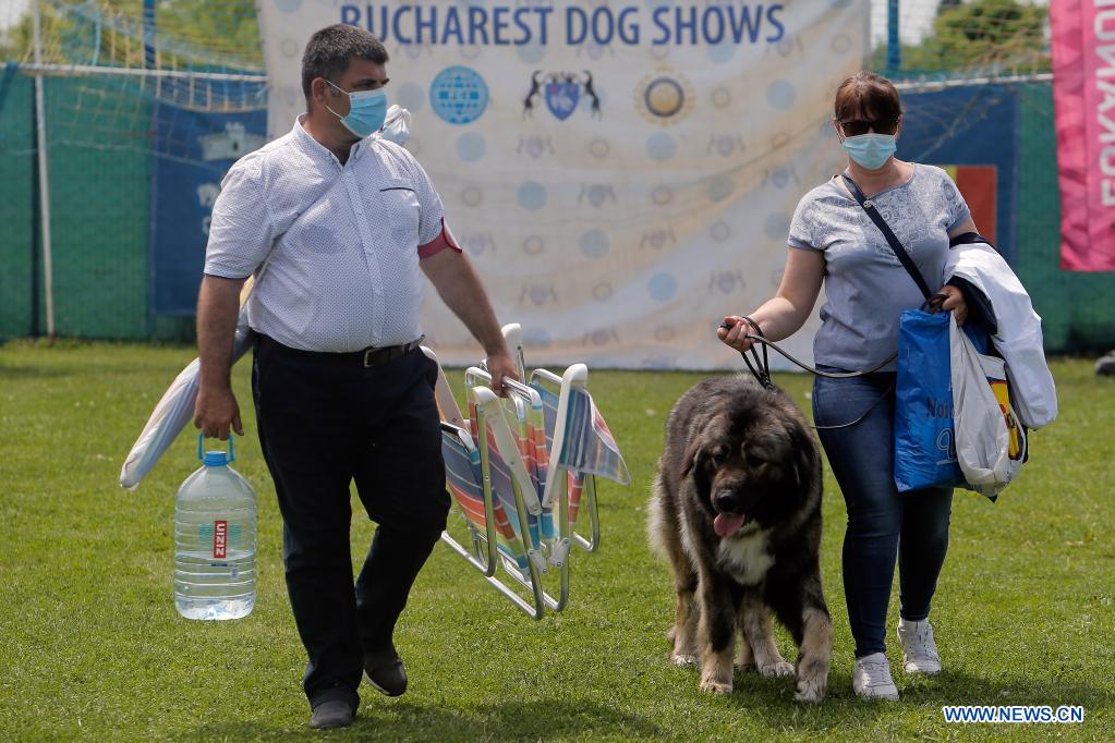 Breeders and their Caucasian shepherd dog leave after competing at a dog show during the COVID-19 pandemic near Bucharest, Romania, May 23, 2021. [Photo by Cristian Cristel/Xinhua]