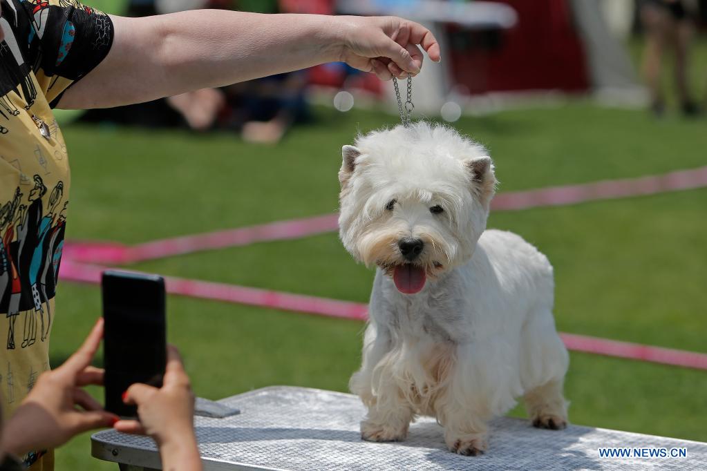 A breeder prepares her Bichon Frise to compete at a dog show during the COVID-19 pandemic near Bucharest, Romania, May 23, 2021. [Photo by Cristian Cristel/Xinhua]