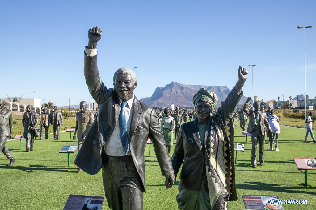 Bronze statues of Nelson Mandela and his wife Winnie Madikizela-Mandela are displayed at a tourist spot named The Long March to Freedom in Cape Town, South Africa, on May 23, 2021. The Long March to Freedom has life-size Bronze statues of 100 individuals who struggled for South Africa's freedom from the early 1700s to Freedom Day in April 1994. [Photo by YLyv Tianran/Xinhua]