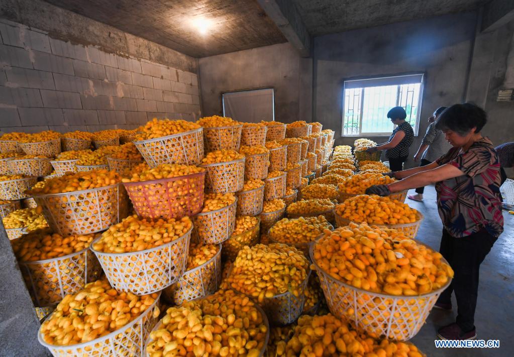 Staff arrange purchased "golden cocoons" at a sericulture cooperative in Jiansheng Village of Tongxiang City, east China's Zhejiang Province, May 26, 2021. Tongxiang, east China's Zhejiang Province, is famous for its over 4,000 years' history of sericulture. Its silkworm breeding and mulberry planting tradition has been listed by the State Council as the national intangible cultural heritage. A new variety of silkworm called "golden cocoon" is pale gold in color. The processed silk of "golden cocoon" has higher lutein content and better antibacterial effect than the ordinary ones. Products made of the cocoons are favored by domestic and overseas markets. The "golden cocoon" has made a great contribution to upgrading local traditional agriculture and increasing farmers' income. In these days, local silkworm farmers embrace the harvest season of the "golden cocoons". (Xinhua/Xu Yu)