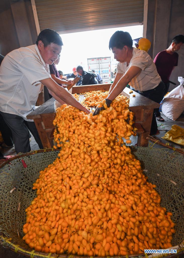 E-mail Xinhua, June 1, 2021Staff arrange purchased "golden cocoons" at a sericulture cooperative in Jiansheng Village of Tongxiang City, east China's Zhejiang Province, May 26, 2021. Tongxiang, east China's Zhejiang Province, is famous for its over 4,000 years' history of sericulture. Its silkworm breeding and mulberry planting tradition has been listed by the State Council as the national intangible cultural heritage. A new variety of silkworm called "golden cocoon" is pale gold in color. The processed silk of "golden cocoon" has higher lutein content and better antibacterial effect than the ordinary ones. Products made of the cocoons are favored by domestic and overseas markets. The "golden cocoon" has made a great contribution to upgrading local traditional agriculture and increasing farmers' income. In these days, local silkworm farmers embrace the harvest season of the "golden cocoons". (Xinhua/Xu Yu)