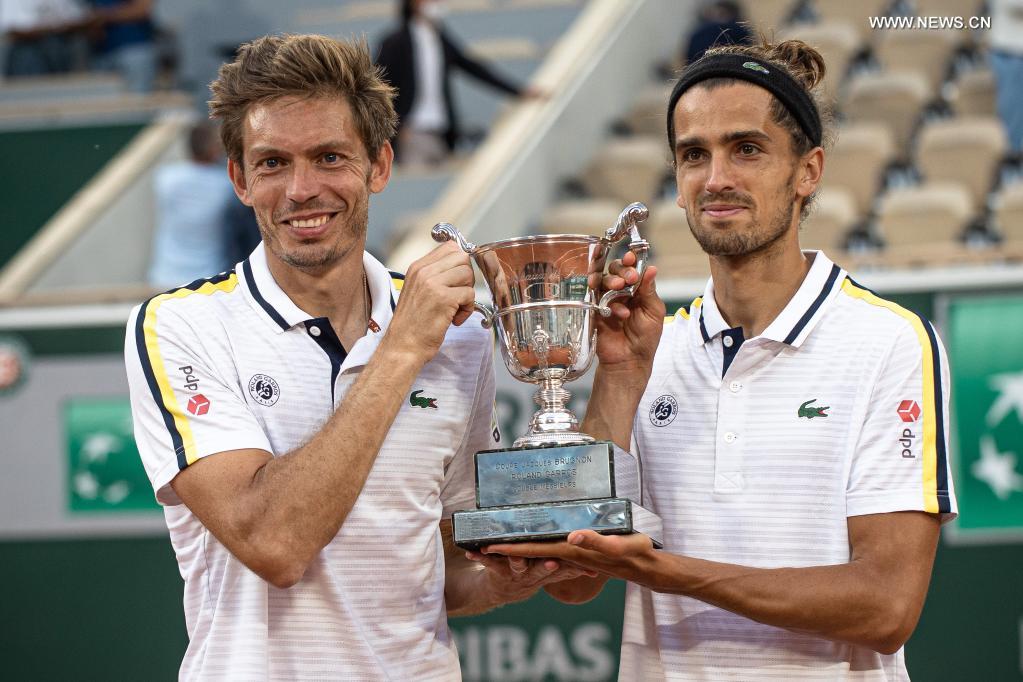 E-mail Xinhua, June 13, 2021Pierre-Hugues Herbert (R) and Nicolas Mahut of France pose with the trophy after the men's doubles final match between Pierre-Hugues Herbert/Nicolas Mahut of France and Alexander Bublik/Andrey Golubev of Kazakhstan at the French Open tennis tournament at Roland Garros in Paris, France, June 12, 2021. [Photo/Xinhua]