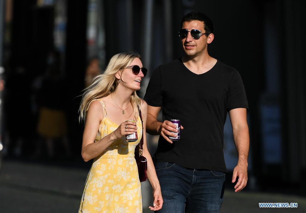 Pedestrians holding beverages walk in downtown Frankfurt, Germany, on June 17, 2021. The highest temperature in Frankfurt reached 36 degrees Celsius on Thursday. [Photo by Lu Yang/Xinhua]