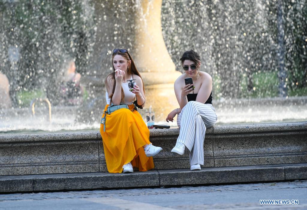 People cool off near a fountain in downtown Frankfurt, Germany, on June 17, 2021. The highest temperature in Frankfurt reached 36 degrees Celsius on Thursday. [Photo by Lu Yang/Xinhua]