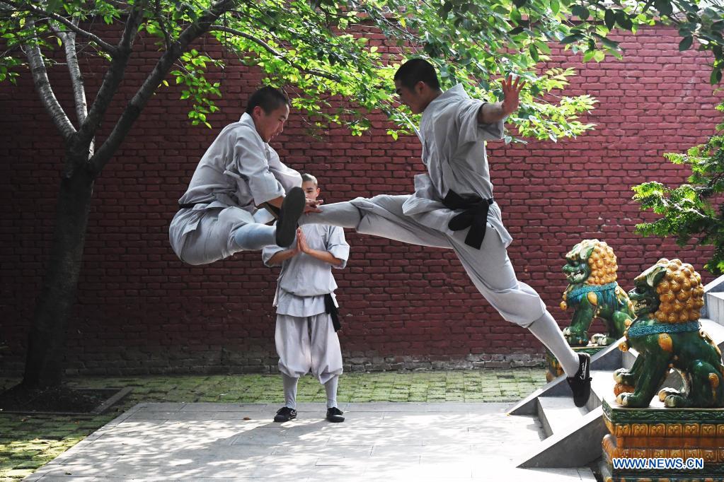 E-mail Xinhua, July 20, 2021Shaolin monks practice martial arts at Shaolin Temple in Dengfeng City, central China's Henan Province, July 8, 2021. Located on the Songshan Mountain, Shaolin Temple is the birthplace for Shaolin Martial Arts. [Photo by Xu Yanan/Xinhua]