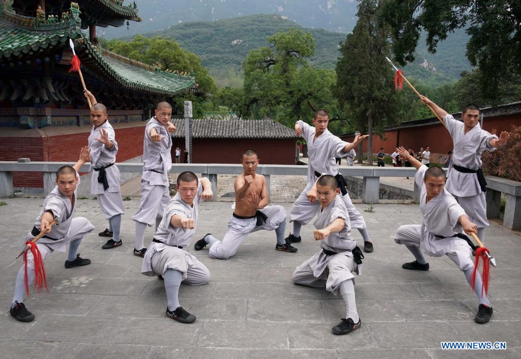 E-mail Xinhua, July 20, 2021Shaolin monks practice martial arts at Shaolin Temple in Dengfeng City, central China's Henan Province, July 8, 2021. Located on the Songshan Mountain, Shaolin Temple is the birthplace for Shaolin Martial Arts. [Photo by Li An/Xinhua]