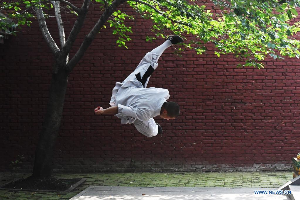 E-mail Xinhua, July 20, 2021A Shaolin monk practices martial arts at Shaolin Temple in Dengfeng City, central China's Henan Province, July 8, 2021. Located on the Songshan Mountain, Shaolin Temple is the birthplace for Shaolin Martial Arts. [Photo by Xu Yanan/Xinhua]