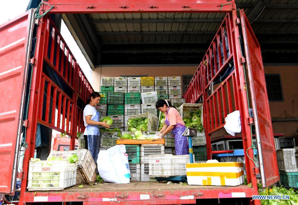 E-mail Xinhua, July 23, 2021Staff members arrange vegetables at a logistic center in Zhongmu County of Zhengzhou, central China's Henan Province, July 22, 2021. Various measures have been taken to ensure supply of agricultural products in Zhengzhou, which was swamped by flood recently caused by heavy rainfall. At present, the supply of vegetables has been adequate with stable price. [Photo by Hao Yuan/Xinhua]