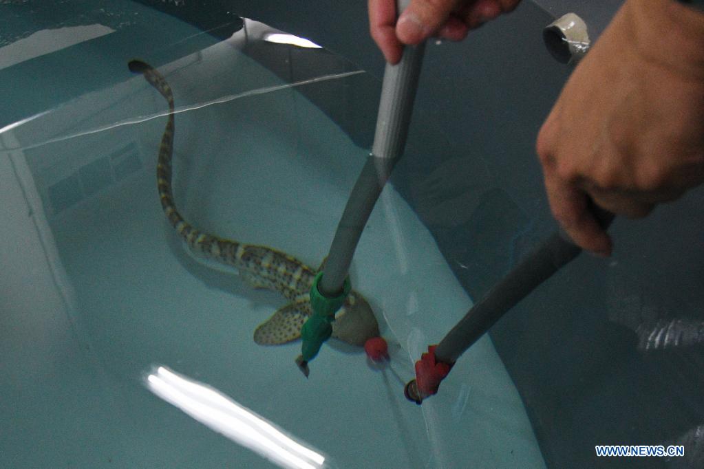 Hope, a parthenogenetically born baby zebra shark, undergoes target feeding training at the S.E.A. Aquarium in Singapore on Aug. 4, 2021. [Photo by Then Chih Wey/Xinhua]