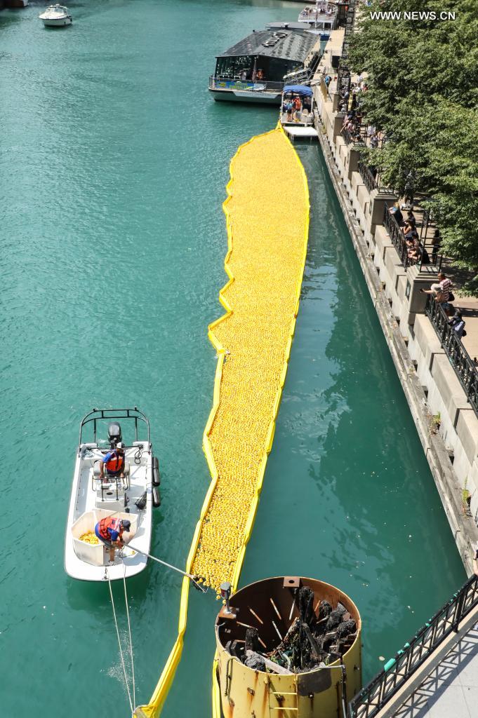 E-mail Xinhua, August 6, 2021Yellow rubber ducks are taken out of the Chicago River in downtown Chicago, the United States, on Aug. 5, 2021. The 2021 Chicago Ducky Derby on Thursday dumped 70,000 rubber ducks into the Chicago River to raise funds for the Special Olympics Illinois. [Photo by Joel Lerner/Xinhua]