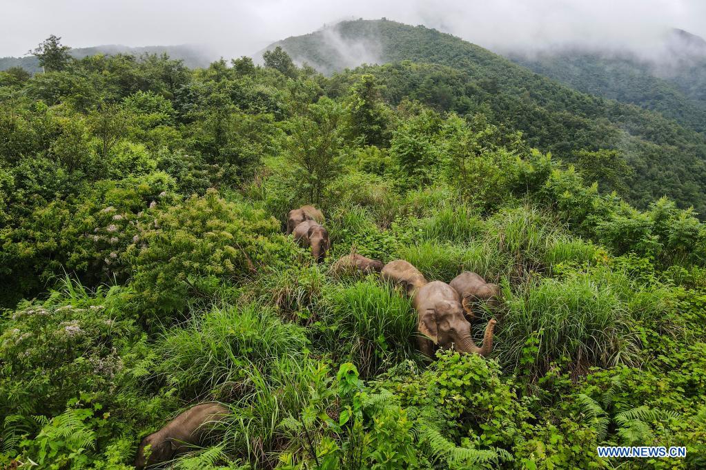 E-mail Xinhua, August 14, 2021Aerial photo taken on Aug. 13, 2021 shows a herd of wild Asian elephants in Mojiang County of Pu'er City, southwest China's Yunnan Province. At 11:48 p.m. Thursday, which was also World Elephant Day, the herd of 14 wandering wild Asian elephants that caught global attention returned to their traditional habitat in Mojiang County of Pu'er City. (Photo by He Yougang/Xinhua)