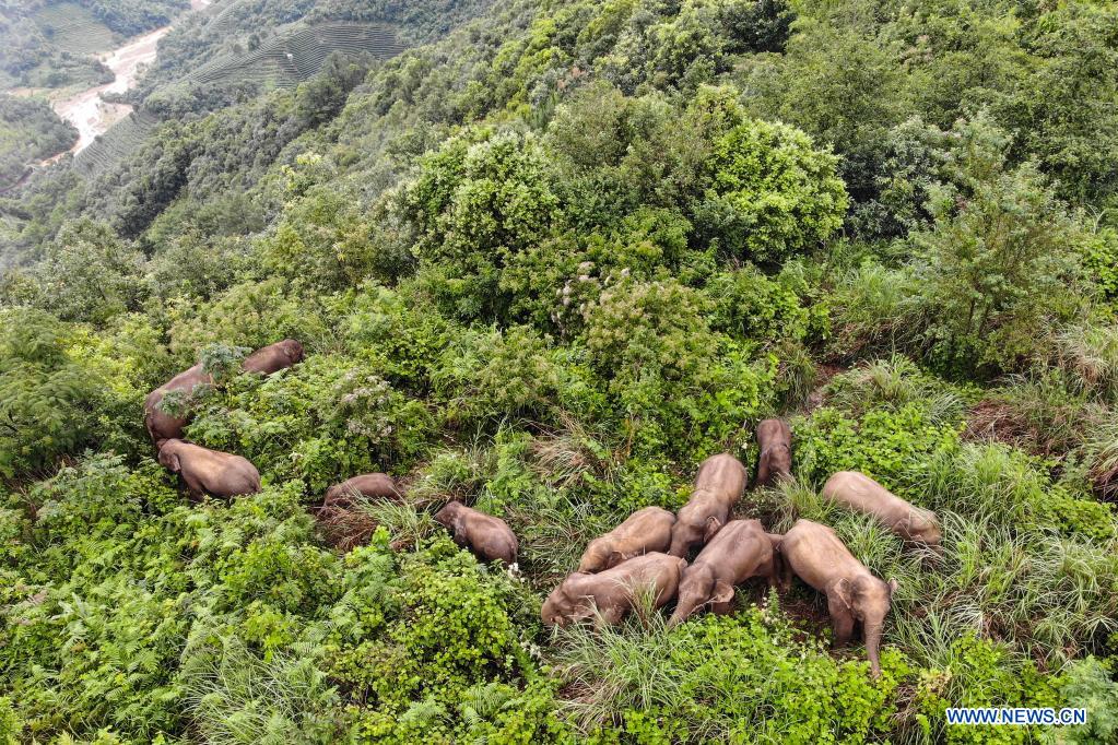Aerial photo taken on Aug. 13, 2021 shows a herd of wild Asian elephants in Mojiang County of Pu'er City, southwest China's Yunnan Province. At 11:48 p.m. Thursday, which was also World Elephant Day, the herd of 14 wandering wild Asian elephants that caught global attention returned to their traditional habitat in Mojiang County of Pu'er City. (Xinhua)